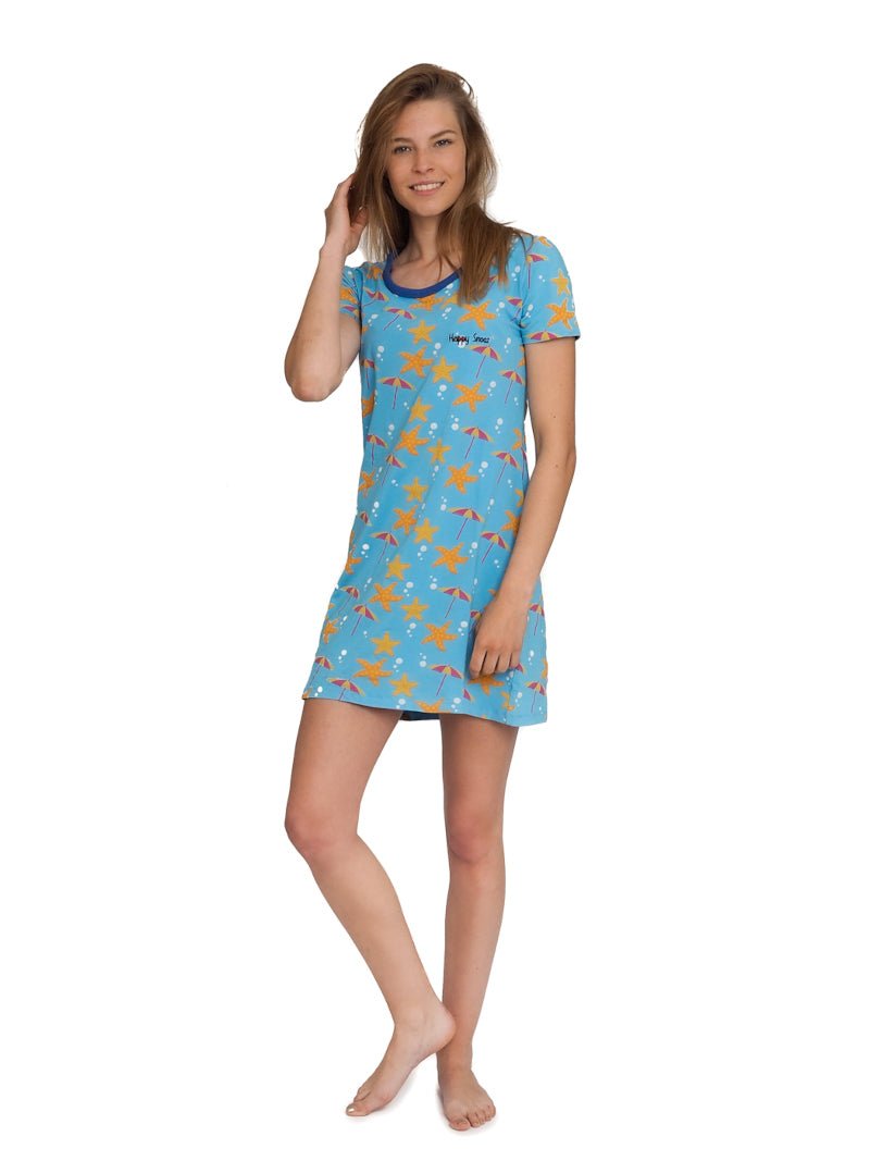 Een dames nachthemd, is eigenlijk een lang hemd. Heel algemeen omschreven, maar de naam zegt het al. Een nachthemd kan lange of korte mouwen hebben. Een dames nachthemd met lange mouwen, zoals deze met pinguïns, is minder geschikt voor de zomer, een dames nachthemd met korte mouwen is juist uitermate geschikt voor de zomer. Je hebt dan blote armen en blote benen, een nachthemd draagt veel luchtiger dan een lange dames pyjama. Een dames nachthemd met korte mouwen hebben wij in 3 vrolijke prints; een paarse, roze en blauw nachthemd.