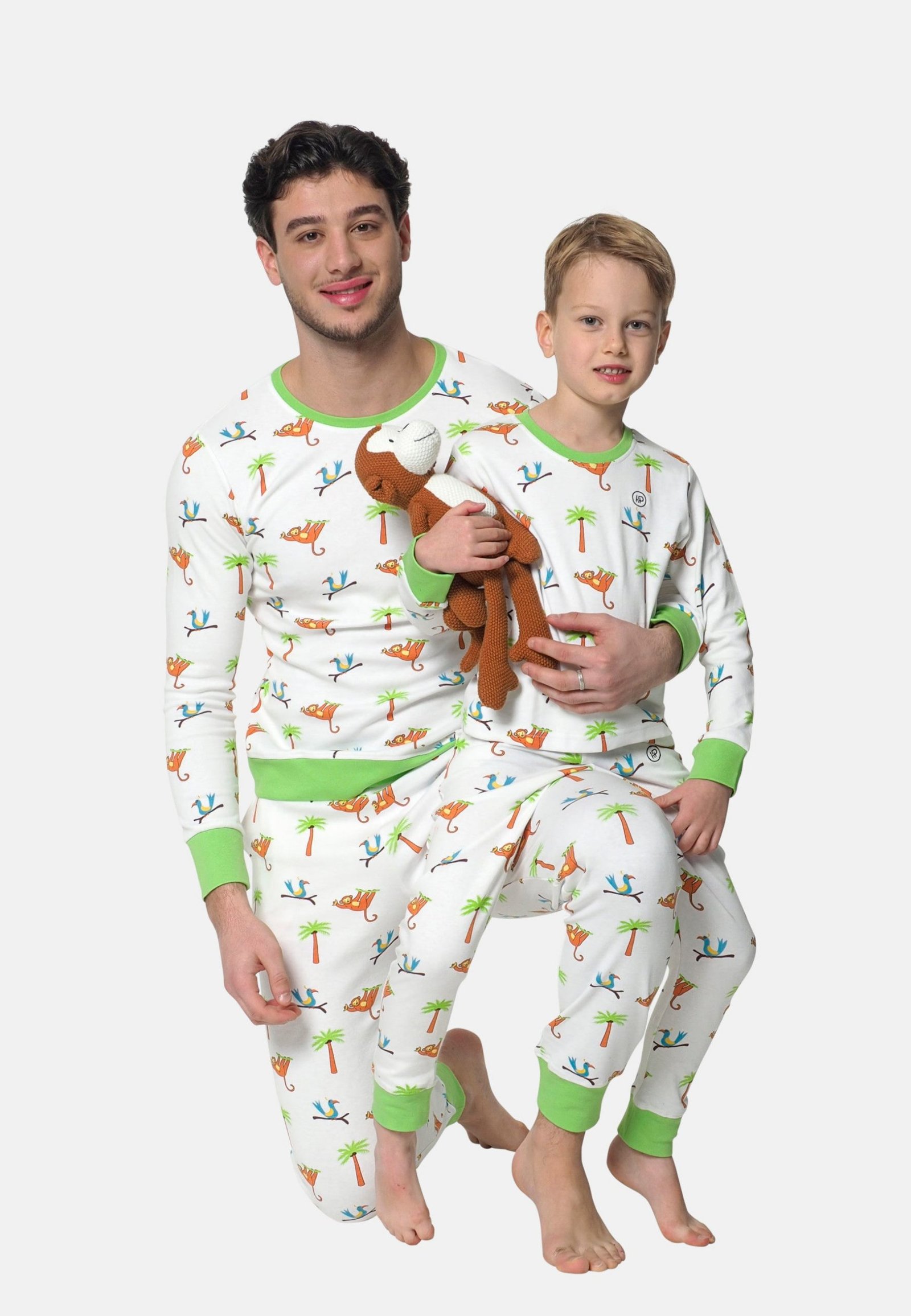 Voor de nachten dat je kleintjes op zoek zijn naar avontuur, is deze kinderpyjama met jungle print een leuke en speelse manier om je kinderen klaar te stomen om naar bed te gaan. Deze pyjama is gemaakt van de zachtste katoen mix en heeft een speelse print van tropische apen en palmbomen. Onze kinderpyjama’s zorgen ervoor dat ze zich warm en comfortabel voelen als ze in slaap vallen.