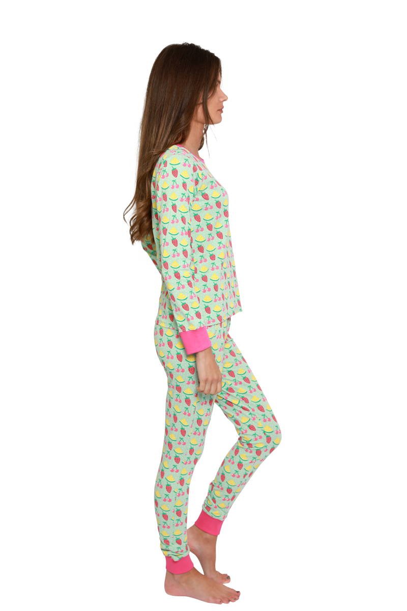 Een prachtige groene damespyjama, die is ontworpen met heerlijk fruit zoals aardbeien, kersen en meloen. De mooie mintgroene kleur van deze damespyjama combineert heel goed met o.a. de roze accenten van de elastische boorden en de kers. Het gele en rode van het fruit zorgt voor een vrolijk geheel. Deze pyjama geeft een mooie zachte en warme uitstraling die ieder zijn gezicht zal laten stralen! Lange mouwen en een lange pyjamabroek zorgen voor genoeg warmte tijdens de wat koudere momenten in Nederland. Heerlijk om te dragen thuis op de bank ’s ochtends of ’s avonds, of als je gaat slapen.