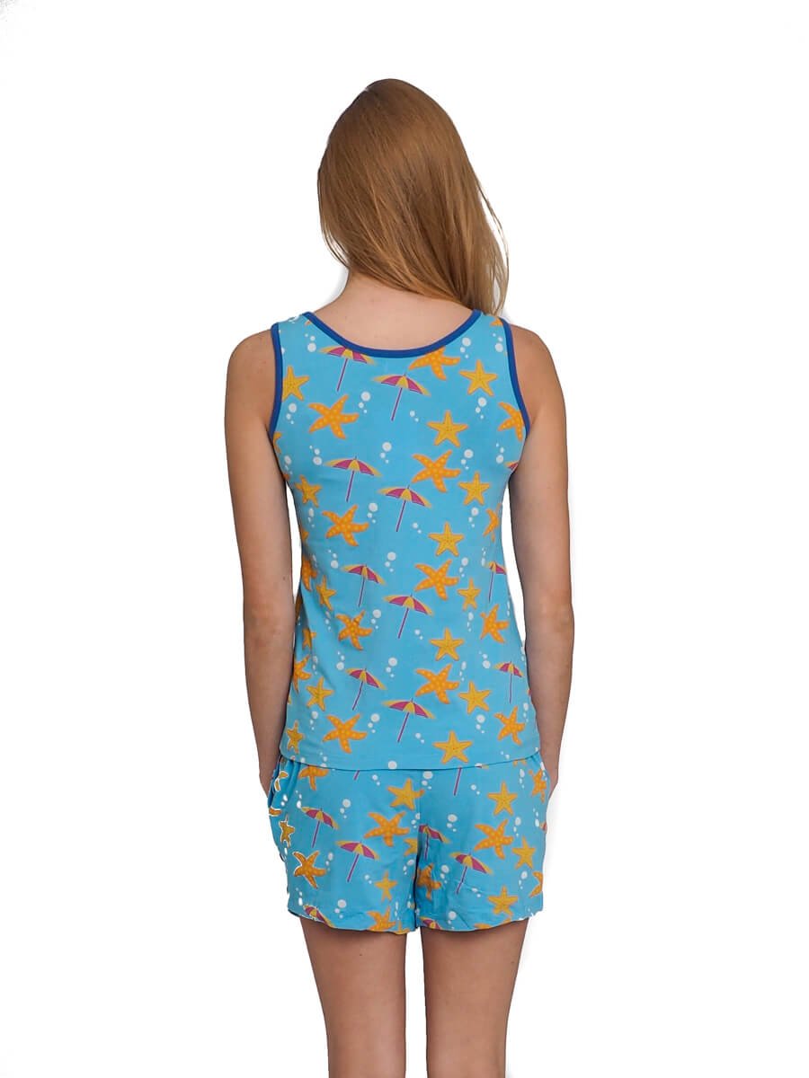 Deze blauwe shortama voor dames heeft de naam Summer Beach gekregen: Een lekker zittende shortama met top en een korte pyjama broek voor de warmere dagen en nachten. Een korte pyjama broek en een hemdje geven je genoeg mogelijkheden tot ventileren en doordat de pyjama gemaakt is van katoen, zal het niet plakkerig worden. Het ontwerp van deze blauwe shortama voor dames is voortgekomen uit het idee van een heerlijke stranddag. De warme zon op je hoofd en het warme zand onder je voeten, een lekker windje erbij voor wat verkoeling, net als de parasol. De dames shortama Summer Beach geeft je een maritieme look met mooie blauwe kleuren die je doen denken aan het stand en de zee!